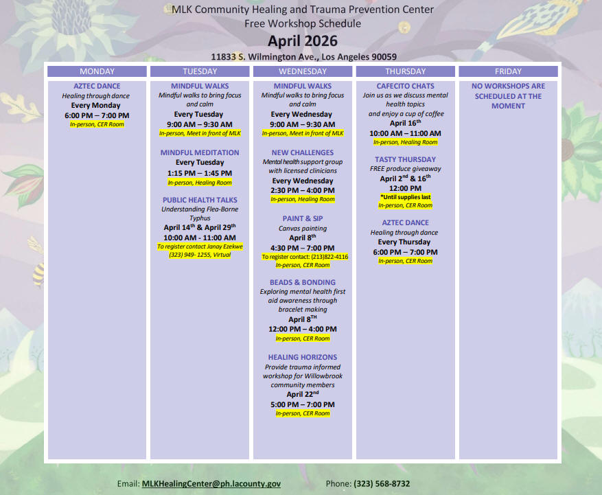 History: The MLK Healing Center was designed and programmed with input from the Willowbrook Community Action for Peace Coalition. The MLK Healing Center was established by DPH West and South LA Regional Health Office in collaboration with the Office of Violence Prevention's Trauma Prevention Initiative team in the Fall of 2018. The Healing Center has become a trusted and safe community space to promote healing and increase access to trauma prevention and intervention services.