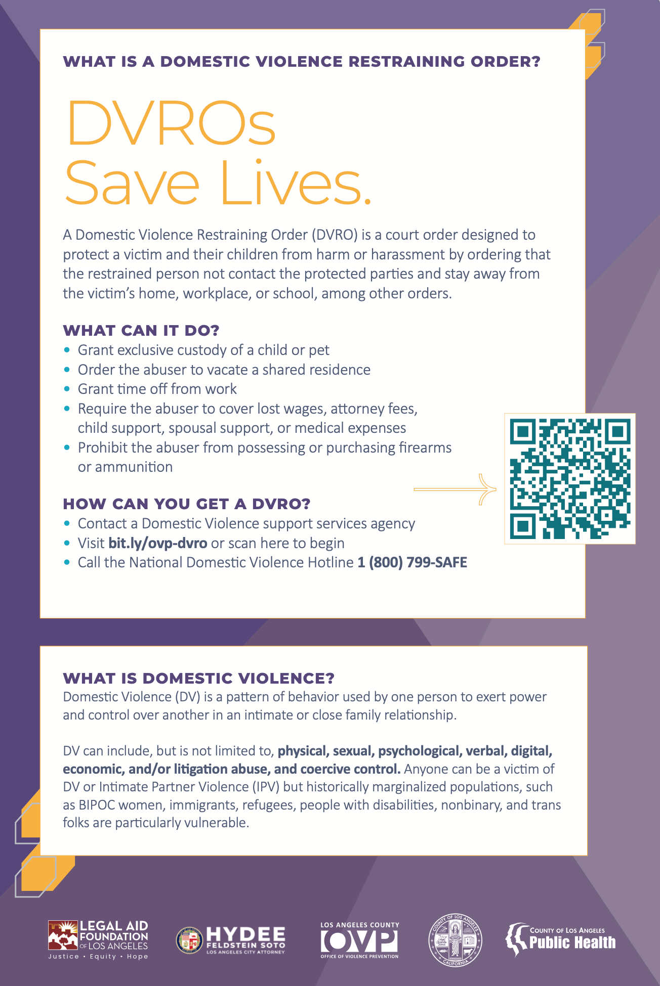 For more detailed information about Domestic Violence Restraining Orders, please download OVP's DVRO Rights Packet and DVRO Poster: